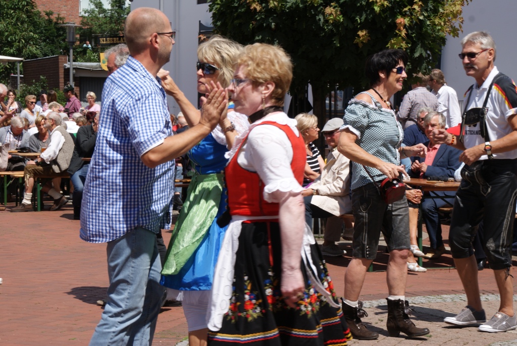 Nach einem Regenguss zum Auftakt strahlte schließlich auch der Himmel blau-weiß beim diesjährigen bayrischen Frühschoppen, zu dem die GHG traditionell am 1. Sonntag im Juli vor das Rathaus eingeladen hatte. Mehrere hundert Sarstedter folgten der Einladung und genossen einen sommerlichen Nachmittag bei bester Stimmung. Die Band „Dick und Durstig“ sorgte wie auch in den Vorjahren mit allem was die Tanzmusik hergab – von Volksmusik über Schlager und Rock, von Andreas Gabalier über Roland Kaiser und Abba bis hin zu Tina Turner – für schwungvolle Unterhaltung. Getreu dem Motto der Veranstaltung waren viele Besucher im schmucken Trachtenoutfit erschienen und schwangen ausgelassen das Tanzbein. Als es allerdings um die Wahl des schönsten Dirndls und der knackigsten Lederhose ging, musste GHG-Vorstandsmitglied Sebastian Krone einige Überredungskünste anwenden, um genügend Teilnehmer vor die Bühne zu bekommen. Schließlich fanden sich jedoch noch sechs mutige Damen und fünf Herren, die sich dem Applaus der Anwesenden stellten. Erstmalig mit einem „Applausometer“ gemessen, um Manipulationen auszuschließen, erntete Adelheid Harms für ihren Auftritt den stärksten Beifall des Publikums, gefolgt von Manuela von Einem und Britta Stein. Den Titel für die schönste Lederhose errang Stefan Klingbiel aus Rössing vor Dirk Bettels und dem Hottelner Nico Ehlers. Die drei Erstplatzierten aller Wettbewerbe erhielten Gutscheine von der GHG. Für die Gewinner gab es zudem einen Gutschein für Eintritt und Verzehr bei der ersten Sarstedter Wies’n, die im September in einer Kooperation zwischen der GHG und alten Schützengilde stattfinden wird. Die jüngsten Besucher in Dirndl und Lederhose konnten sich hingegen über kleine Präsente freuen. Das von vielen mit Spannung erwartete Maßkrugstemmen fand in diesem Jahr allerdings nicht statt. „Wir haben uns anstatt dessen für mehr Musik von der Band entschieden“, erklärte der GHG Vorsitzende Roger Olbinsky und so ließen die Besucher den Nachmittag bei strahlendem Sonnenschein mit Brezn, bayrischen Schmankerln und einem zünftigen Bier ausklingen. (cn)