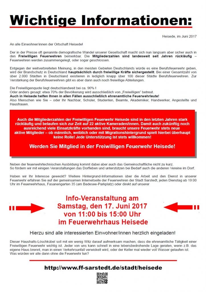 Bleibt nur zu hoffen, dass die Aktion Früchte trägt und sich viele der angesprochenen Einwohner am Samstag, dem 17.06.2017 zur Informationsveranstaltung der Heiseder Kameraden einfinden. Diese findet im Feuerwehrhaus am Badesee in der Zeit von 11.00 bis 15.00 Uhr statt.