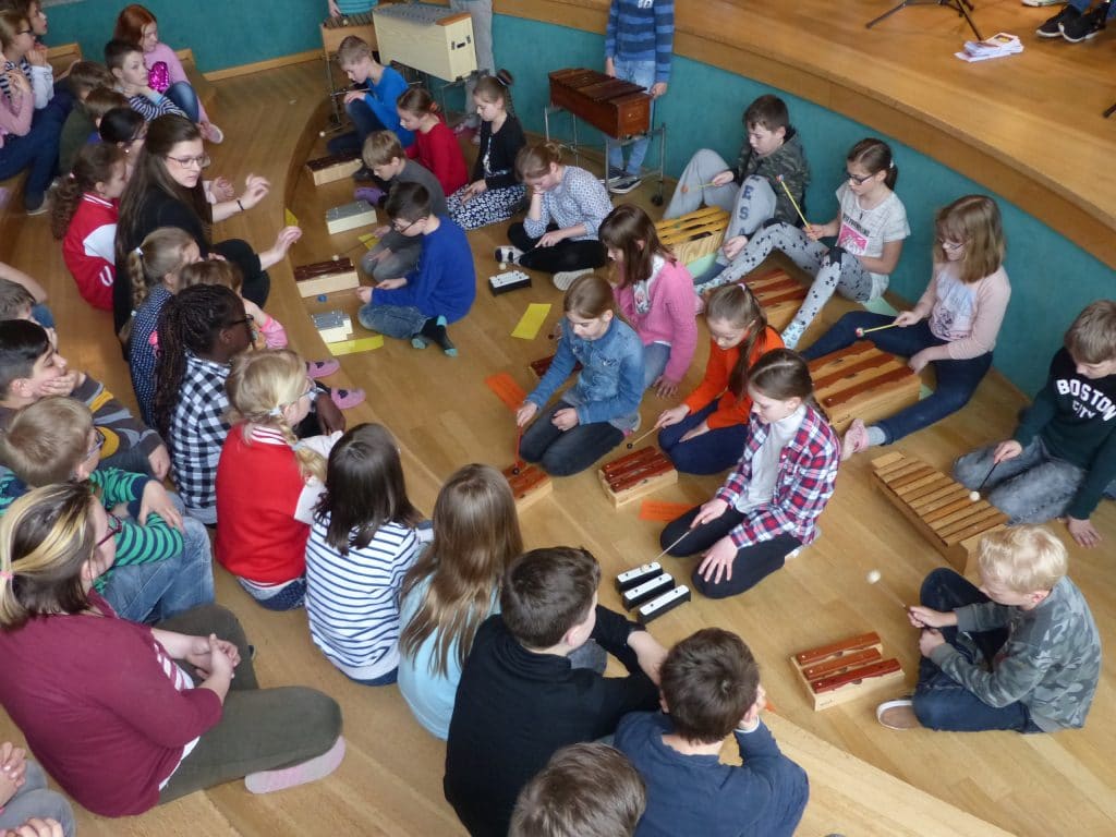 In den vergangenen Wochen wurde in den Klassen fleißig der Liederreigen geübt, der diesmal auf dem Programm steht. Unter der Leitung von Anwärterin Anna Pleister, die gerade zwei Tage zuvor ihre Abschlussprüfung in der Regenbogenschule mit Bravour bestanden hatte, gab die Klasse 4a am Freitag, dem 13. April für ihre Mitschülerinnen und Mitschüler schon mal ein Ständchen mit eigener instrumentaler Begleitung im Forum der Schule. „Siyahamba – We are marching in the light of god“ schmetterten sie sicher. Auf dem Programm stehen aber auch Klassiker wie „Kein schöner Land in dieser Zeit” und „Bruder Jacob” oder „Ich wollt’ ich wär’ ein Huhn”. Dazu gibt es Bewährtes, das seit Jahren bei „Klasse!Wir singen!“ zu hören ist wie „Zwei kleine Wölfe“ und natürlich das Erkennungslied „Klasse!Wir singen!“, bei dem am Freitag auch das Publikum fröhlich mitsang.
