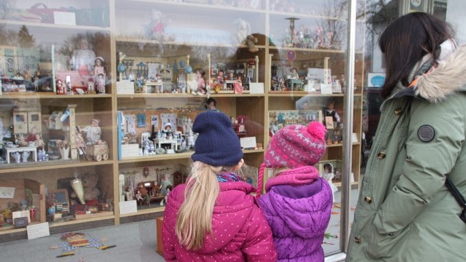Im linken Schaufenster präsentiert die Sarstedter Sammlerin Christiane Leitzke, deren Geschäft „Mehlkammer“ in der Holztorstraße schon früher ein Hingucker war, Dutzende historische Puppenstuben, viele mit der Originalausstattung bekannter Hersteller wie beispielsweise der Firma Moritz Gottschalk aus dem Erzgebirge. Wenige sind aus dem ausgehenden 19. Jahrhundert, die meisten jedoch aus den 1920er und 1930er Jahren. „Bauernstuben“, Wohn- und Kinderzimmer sind zu sehen, Puppenküchen und Kaufläden, eine Bärenschule und ein Badezimmer im Stil der 50er Jahre, alles mit unzähligen, liebevoll ausgestalteten Details ausgestattet. Dazu kleine Modelle, die zeigen, wie Kinderwagen in vergangenen Zeiten aussahen und allerlei Accessoires wie zum Beispiel der mit Spiritus betriebene Puppenherd oder das „Stettiner Puppen-Kochbuch“, dessen Rezepte man auch heute noch nachkochen könnte. Nur die angegebenen Mengen muss man wohl hochrechnen. ¼ Ei und 17 Gramm Mehl für das Waffelrezept sind einfach zu schwierig abzumessen. (Christina Steffani-Böringer)
