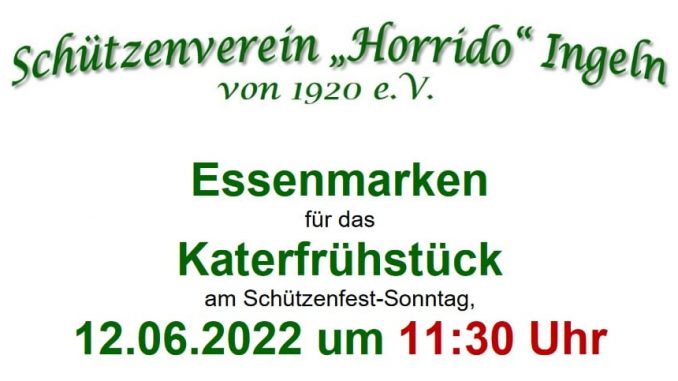 Ab sofort können Essensmarken für das Katerfrühstück des Schützenvereins „Horrido“ Ingeln erworben werden. Erhältlich sind diese jeden Dienstag ab 19.30 Uhr im Schützenhaus oder beim Festausschuss: