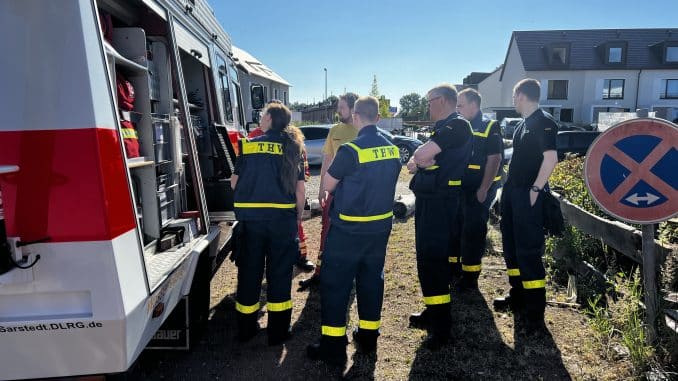 Vorher stand jedoch ein gemeinsamer Materialcheck auf dem Plan. Hierbei sollten alle Helfenden das Fahrzeug, den Aufbau und die Ausrüstung der jeweils anderen Organisation kennenlernen.