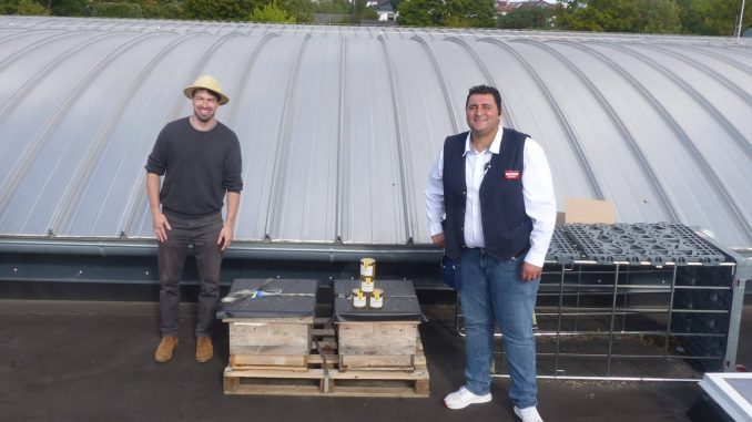 Andere Bedrohungen wie Wespen, die in den Stock eindringen und Honig klauen oder Hornissen, die auch die Bienen selbst auffressen können, sind auf dem REWE-Dach weniger ein Problem. „Ein paar Wespen sind es schon immer wieder, die durch das Schlupfloch eindringen, aber das verkraftet der Stock.“ Die Versorgung mit Pollen und Nektar sei gut rund um den REWE-Markt. So gut, dass sich Schulze-Musiol und Marktleiter Rizzo noch ein paar mehr Stöcke auf dem Dach vorstellen könnten im nächsten Jahr, „wenn der Absatz gut ist…“, wie Antonio Rizzo hofft.