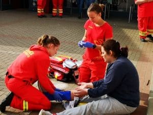 Der Sonntag stand dann ganz im Zeichen des Abschlusses. Während sich die Teilnehmenden des RUND-Kurses mit Brüchen oder auch Fremdkörpern in Wunden beschäftigten, mussten die Prüflinge mit dem Theorietest und der Prüfung zur Herz-Lungen-Wiederbelebung zwei von drei Prüfungen absolvieren. Nach einem gemeinsamen Mittagessen ging es anschließend in die Fallbeispiele. Auch hier mussten wieder Szenarien entsprechend abgearbeitet werden, um am Ende die Qualifikation des Sanitätshelfers in den Händen halten zu dürfen. So mussten neben Fahrradstürzen, Krampfanfällen oder Heringen von Zelten im Fuß auch Unterkühlungen oder Herzinfarkte versorgt werden. „Ich hoffe, keiner der Anwohner ruft hier gleich in der Rettungsleitstelle an“, zeigte sich Ausbilder Christoph Winter erstaunt über die sehr gute Leistung der Teilnehmenden des RUND-Kurses.
