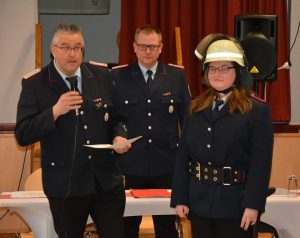 Christian Eggert von der Einsatzabteilung erläuterte nicht nur den Anstieg der Einsätze um 20 im Vergleich zum Vorjahr auf 55, sondern beglückwünschte auch die zweite Frau, die ihre Ausbildung als AGT (Atemschutzgeräteträgerin) absolviert hat: Hanna Schierloh.