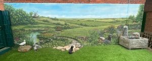 Beim Streifzug über den Hof wurde auch das Landschaftsbild mitsamt Feldern, Blumen, Teich und Mühle von Graffitikünstler Ole Görgens bewundert. Das Werk, für welches auch Hofhund Bonny Modell gesessen hat, verschönert seit dem Jahr 2000 eine Wand der höfischen Sitzecke. Die Entwicklung des Bildes und die intensive Arbeit, die in das Werk floss, ließen sich anhand eines Fotoalbums nachvollziehen.