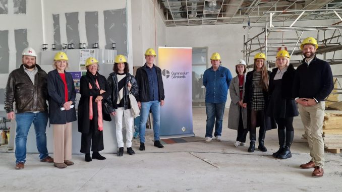 „Es fehlt noch ein wenig die Vorstellungskraft“, resümiert Schulleiter Dr. Joris Doelle bei der Begehung der Schulbaustelle schmunzelnd. Dort, wo sich laut Zeitplan nach den Osterferien 2025 die ersten Schülerinnen und Schüler tummeln sollen – und derzeit sieht alles danach aus – hängen derzeit noch offene Deckenelemente und eine dicke Schicht aus Baustaub bedeckt den Boden des Foyers. Vor dieser tristen Baustellenkulisse sticht der bunte Aufsteller mit dem neuen Schullogo umso mehr hervor. Das tiefschwarze Logo nebst Schulnamen auf einem Hintergrund mit freundlichem und harmonischem Farbverlauf wirkt einerseits vertraut und doch irgendwie neu und anders.