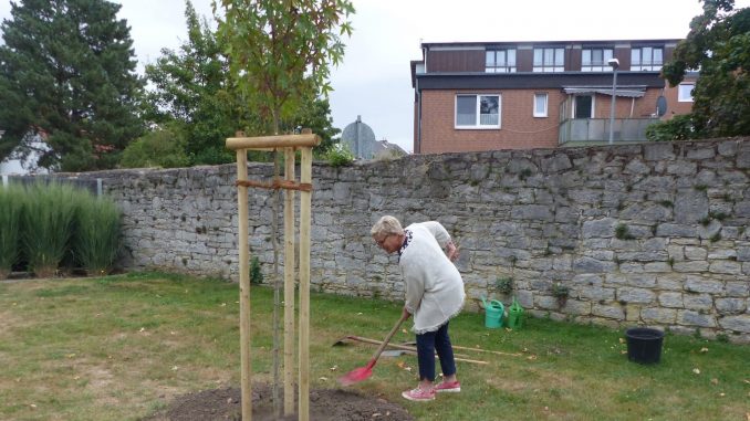 Und so eine Nominierung nimmt Heike Brennecke selbstverständlich an. Am Montag, 1. September pflanzte sie daher auf der Grünfläche des Sarstedter Freibads einen Amberbaum, per Video dokumentiert von Stadtmanagerin Andrea Satli für die Sozialen Medien. Wobei sie tatkräftige Unterstützung durch Michael Mrowka vom Bauhof der Stadt erhielt, der vor dem feierlichen Spatenschwingen durch die Bürgermeisterin bereits das Pflanzloch ausgehoben, die Erde mit weiterem Substrat angereichert und den Baum samt einem Stützpfahl ins Pflanzloch gesetzt hatte.