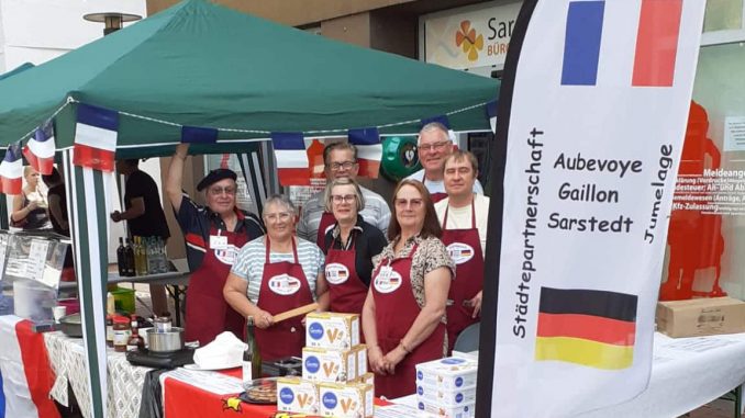 Den Kartoffelmarkt am 7. September nahmen sieben Franzosen aus den Sarstedter Partnerstädten Aubevoye und Gaillon zum Anlass für einen Besuch und boten vor dem Rathaus neben dem Stand des Sarstedter Komitees für die Städtepartnerschaft mit ihrem eigenen Stand Spezialitäten der Normandie an. Damit wurde diese seit mehr als 25 Jahren bestehende Tradition, die sich aus der 1992 entstandenen Städtepartnerschaft zwischen Sarstedt und Aubevoye-Gaillon entwickelte, fortgesetzt.