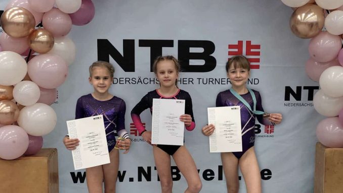 Ihr fleißiges Training im Leistungszentrum in Hannover zusammen mit dem Training in ihren Vereinen in Sarstedt zahlte sich am Ende aus: Von 32 Starterinnen erreichte Emily Platz 8, Anelya Platz 5 und Merle schaffte es mit Platz 3 sogar aufs Treppchen. In ihren neuen Turnanzügen strahlten die Drei am Ende des Wettkampfes unter einem Luftballon-Bogen.
