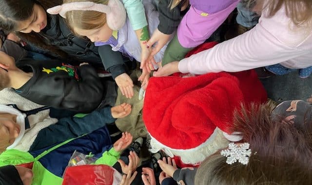 Absolutes Highlight war natürlich auch in diesem Jahr wieder der Besuch des Weihnachtsmannes. Mit einem prall gefüllten Sack tauchte er plötzlich aus dem Keller auf und zog sogleich die kleinen Gäste in seinen Bann. Kein Wunder, hatte er doch für jedes Kind eine süße Weihnachtsmütze dabei.