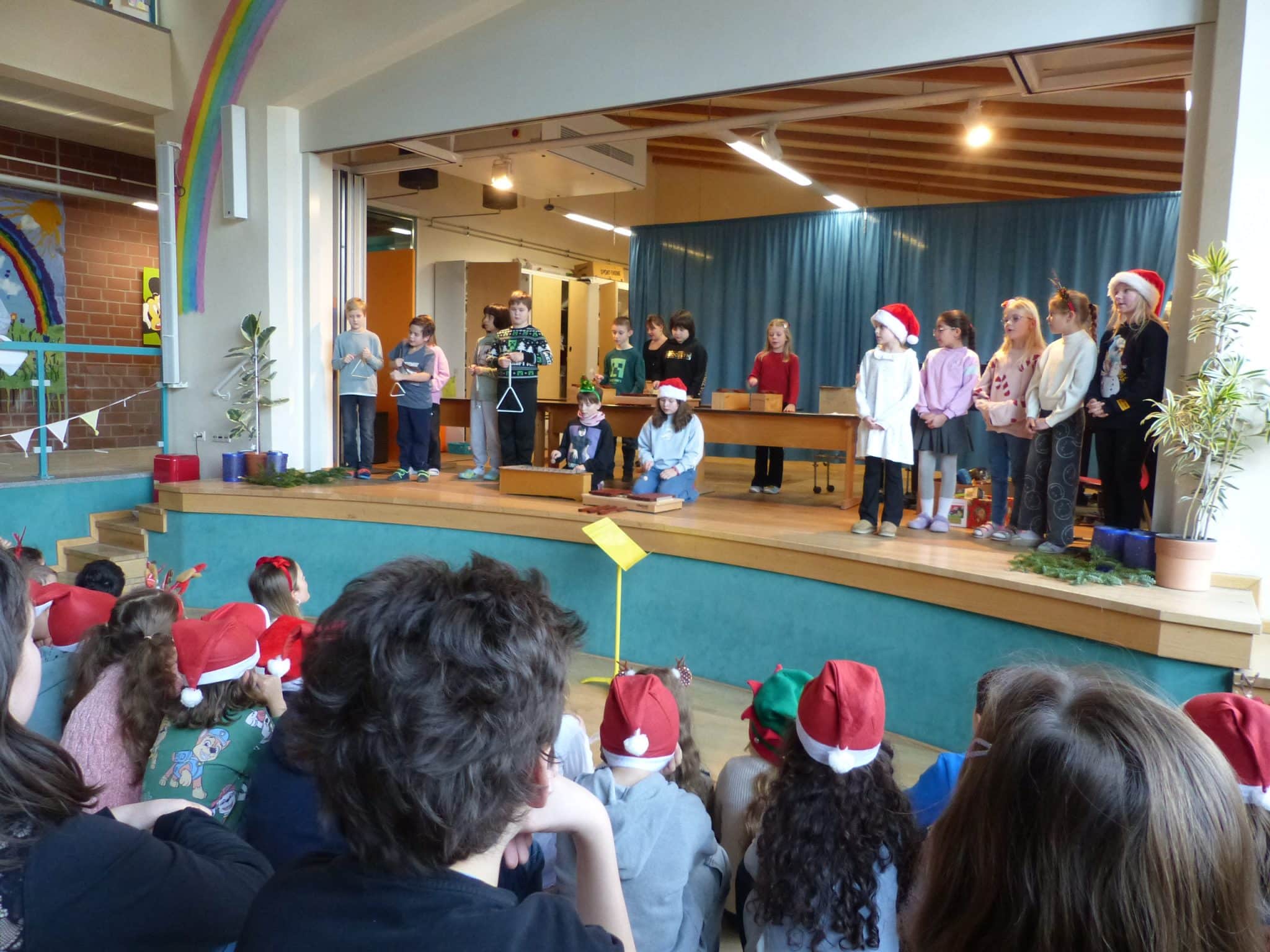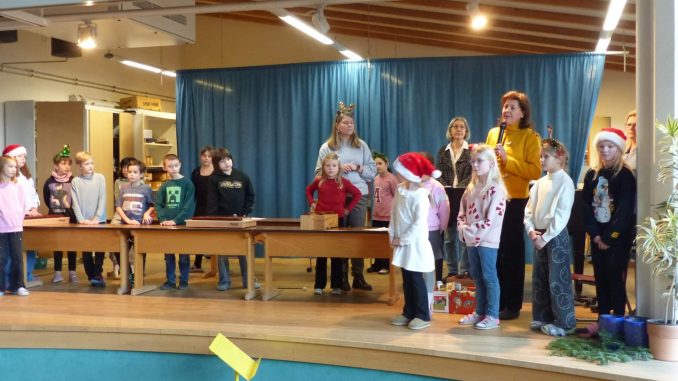 Es ist Weihnachtsforum an der Regenbogenschule. Eines von mehreren. Über die ganze Vorweihnachtswoche verteilt, hat die Regenbogenschule in mehreren Foren ihre Grundschülerinnen und Grundschüler auf Weihnachten eingestimmt. Im Publikum an diesem grauen Dezembervormittag eine Woche vor Weihnachten nicht nur die Schülerinnen und Schüler der anderen Klassen, die etwas vorführen, sondern auch Eltern und Großeltern und einige kleinere Geschwister.