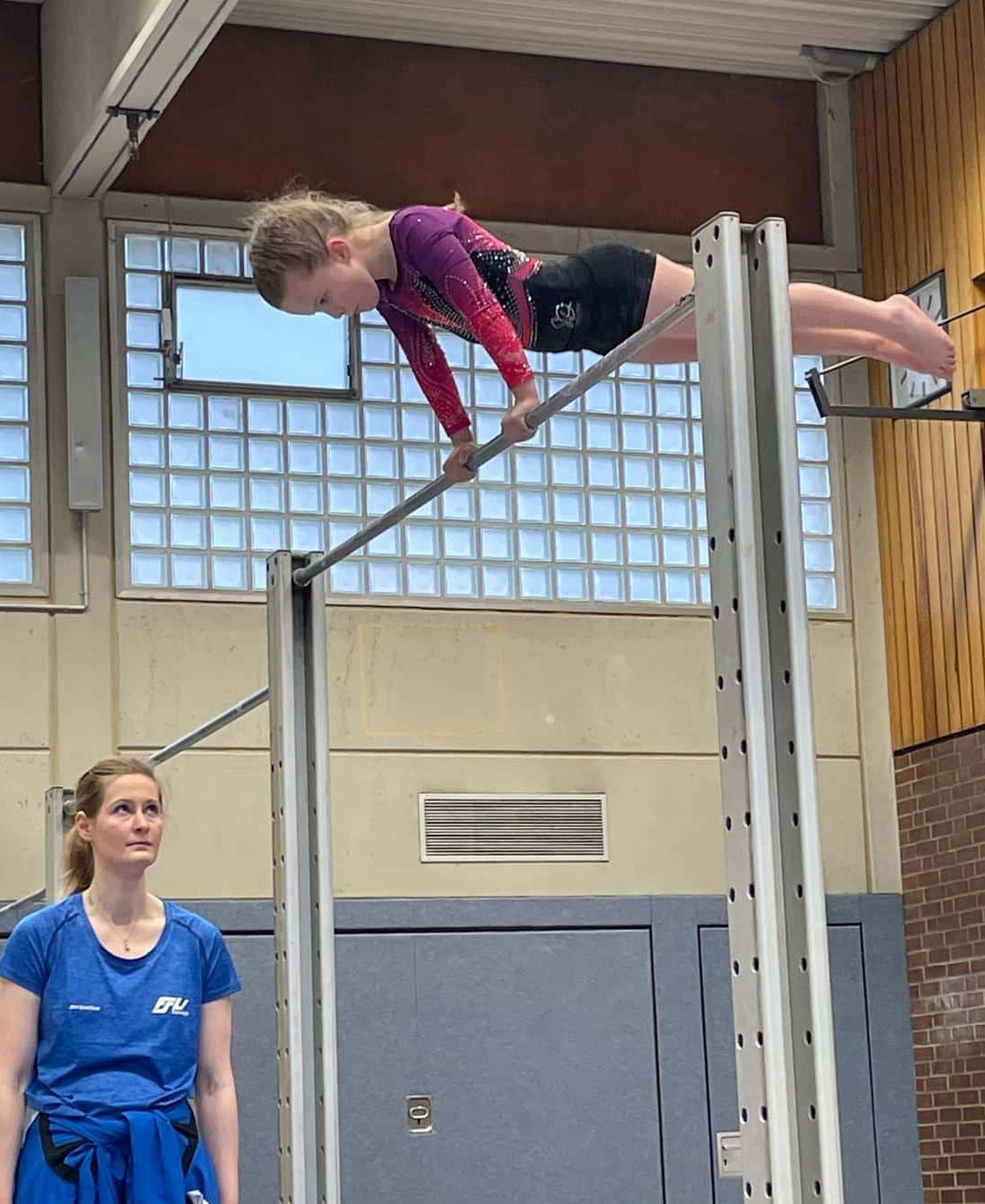 Weiter ging es mittags mit Laura Rubin (FSV) in der LK1. Sie hatte nur eine Konkurrentin und startete wegen einer Verletzung nur am Balken und Stufenbarren, an dem sie erstmals das Schwingen in den Handstand schaffte.