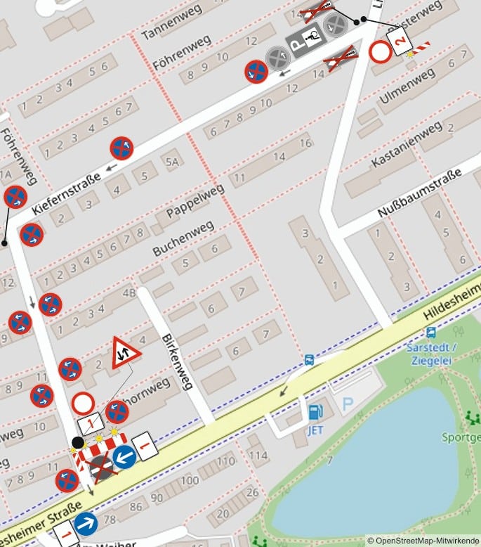 Auch in der Sarstedter Kernstadt kommt es zu Verkehrsbeeinträchtigungen. Aufgrund von Tiefbauarbeiten in der Kiefernstraße wird die Straße auf Höhe Pappelweg und Buchenweg bis oberhalb des Birkenwegs für den Pkw-Verkehr voll gesperrt. Radfahrer und Fußgänger können an der Baustelle vorbei die Straße passieren, die Übergänge werden bauseits mit Grabenbrücken versehen.